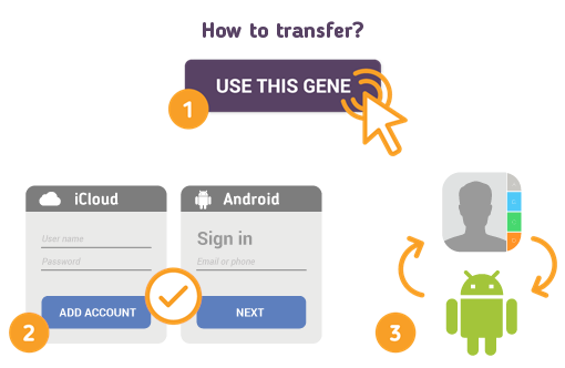 Transfer Contacts between iOS and Android with SyncGene. Setup SyncGene in just a few clicks and Contacts will be transferred. Contacts can be transferred between Google, iCloud or Office 365 and your mobile devices.